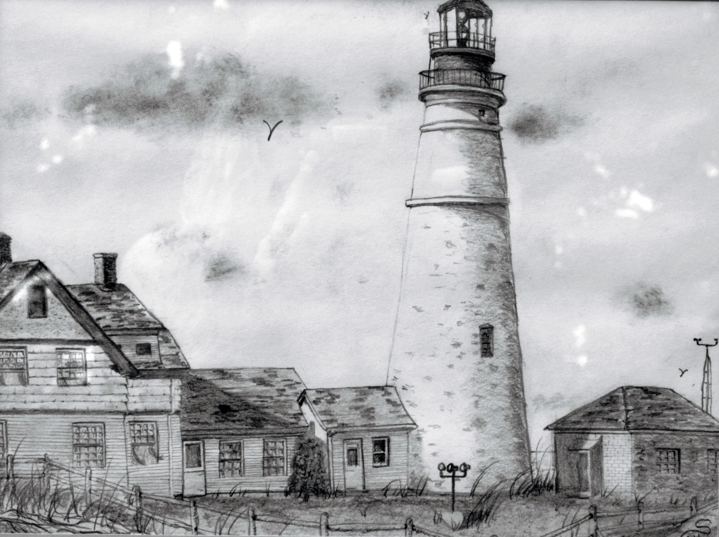 A detailed coastal lighthouse scene with surrounding buildings, rendered with soft tonal shading and fine linework.